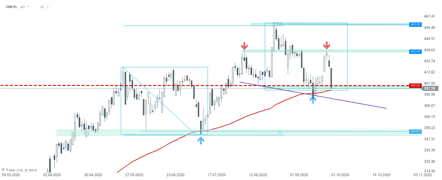 W dzisiejszej analizie przyjrzymy się sytuacji technicznej na akcjach CD Projekt (CDR.PL), gdzie obserwujemy solidną ponad 5% wyprzedaż. Dzisiejsze spadki są tłumaczone wiadomością o prowadzeniu 6 dniowego tygodnia pracy do czasu premiery nowej gry - Cyberpunk 2077 (co może sugerować problemy z ukończeniem projektu). Patrząc techniczne na wykres, notowania miały w ostatnim czasie wyraźny problem z pokonaniem oporu przy 433,5 zł, skąd rozpoczęła się aktualna przecena. Na interwale H4 widać także budującą się formacji głowy z ramionami, co może zapowiadać zmianę tendencji. Niemniej aktualnie kluczowe pozostają okolice okrągłego poziomu 400 zł, które w połączeniu z wcześniejszymi reakcjami cenowymi oraz średnią SMA100 powinny stanowić kluczowe wsparcie.