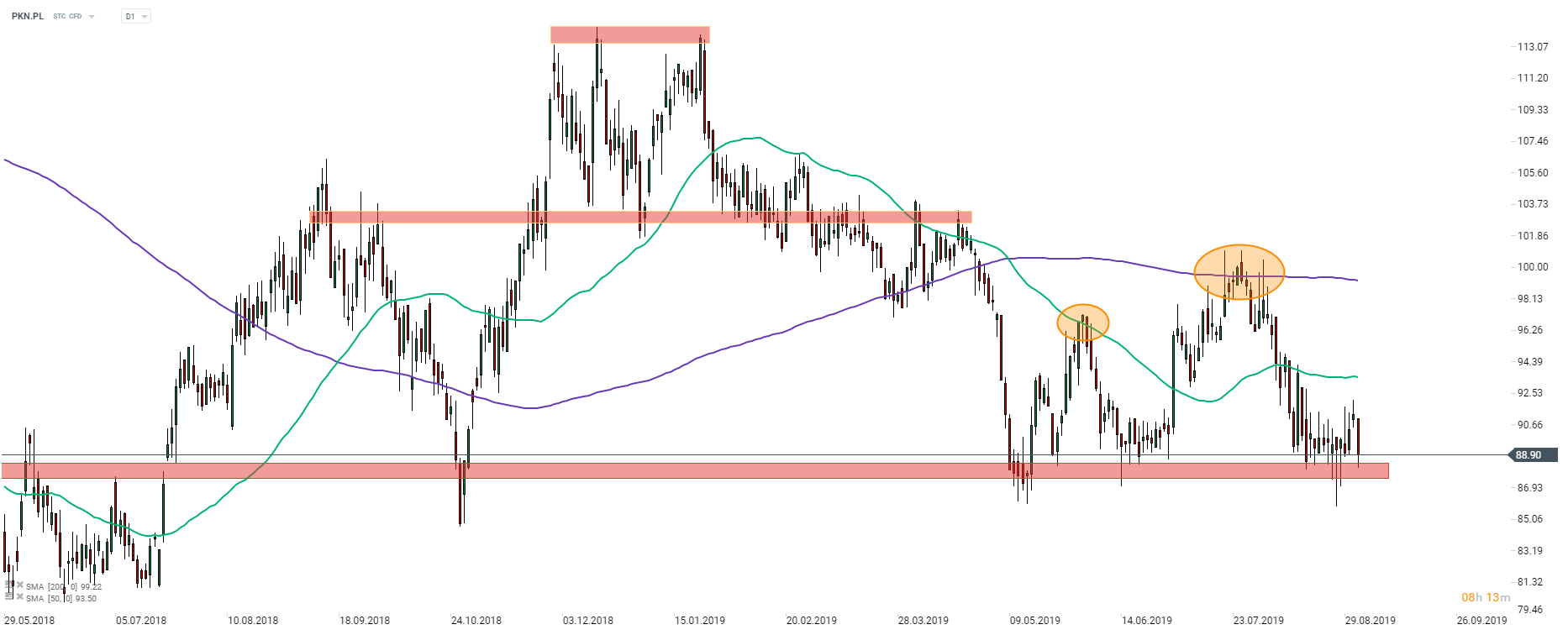 Kurs akcji PKN Orlen (PKN.PL) od kilku tygodni utrzymuje się w blisko strefy wsparcia rozciągajacej się między poziomami 87,50 PLN i 88,50 PLN. Dzisiejszy spadek skutkuje kolejnym testem wspomnianej strefy jednak jak na razie nie niedźwiedziom nie udało się jej sforsować. Ewentualne odbicie mogłoby doprowadzić cenę do pierwszego, lokalnego oporu - 50-sesyjnej średniej kroczącej (zielona linia). Źródło: xStation5