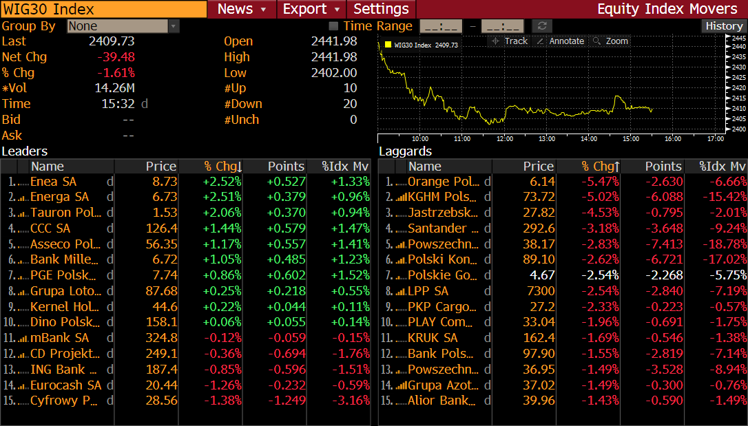 Spółki energetyczne jak jedne z niewielu odnotowują dziś wzrosty. Źródło: Bloomberg