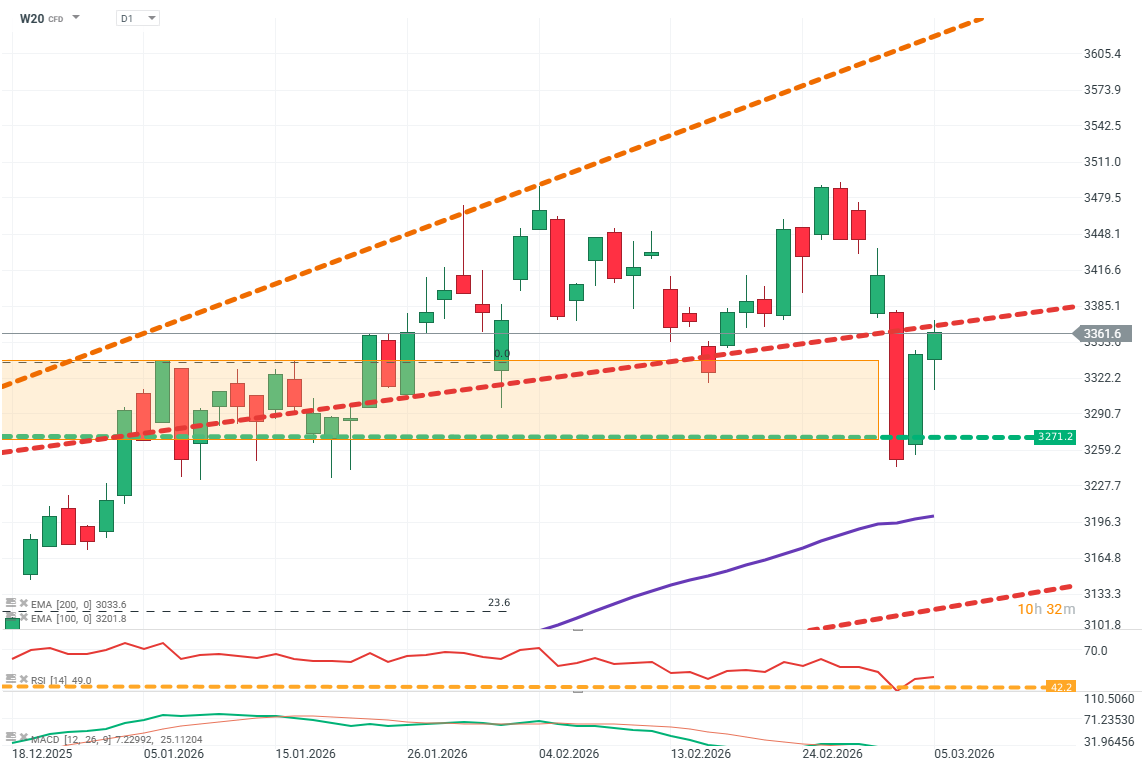 Kupujący na chwilę obecną skutecznie obronili poziom 3270, jednak popyt w dalszym ciągu ma problem z powrotem do kanału wzrostowego, w którym indeks utrzymywał się między grudniem a lutym.