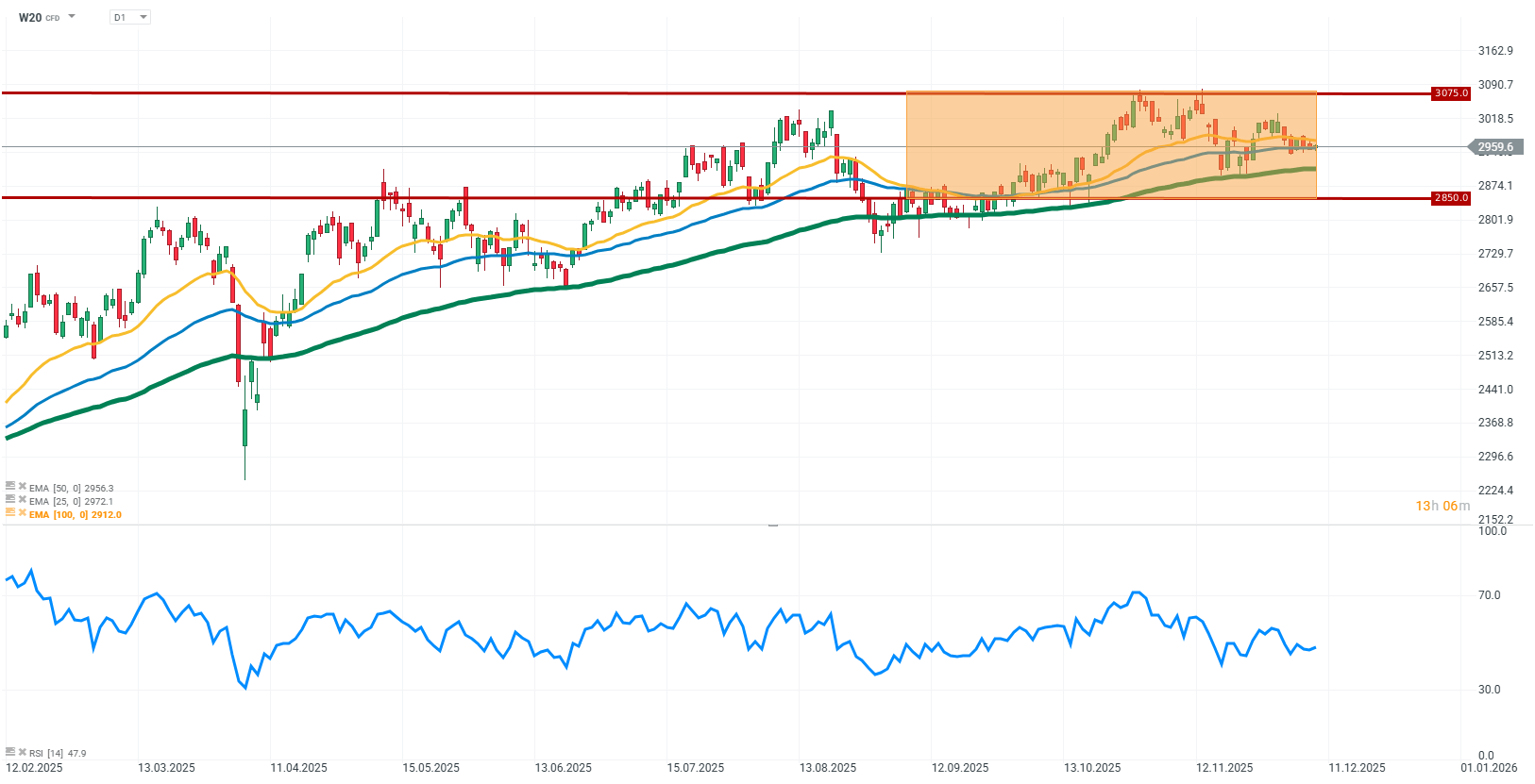 Kontrakty na indeks WIG20 (W20) zyskują nieznacznie podczas dzisiejszej sesji. Ostatnio przewagę zdobywa strona popytowa, jednak nadal brakuje wyraźnych impulsów, które mogłyby zapoczątkować trwały trend wzrostowy. Kurs konsoliduje się od dłuższego czasu w przedziale 2950–3030, oczekując na dodatkowy bodziec do silniejszego ruchu. Takim impulsem może okazać się nadchodząca decyzja Rezerwy Federalnej w sprawie stóp procentowych.