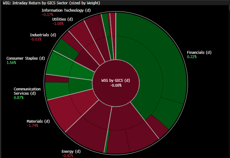 Na GPW trwa spokojna, lekko mieszana sesja, z przewagą konsolidacji i niewielką zmiennością. Na godzinę 11:00 szeroki indeks jest około 0,1% pod kreską, co sygnalizuje lekką przewagę podaży w ujęciu szerokiego rynku, ale bez wyraźnego załamania dotychczasowego trendu. WIG20 zyskuje 0,25%, pokazując neutralne, wyczekujące nastawienie inwestorów przy braku mocnego kierunku. Najlepiej w indeksie blue chipów radzą sobie Dino Polska oraz CD Projekt, które zyskują odpowiednio około 2,5% oraz 1,7%. Na drugim biegunie mamy KGHM tracący w tym momencie blisko 2,5% oraz CCC dla której jest to kolejna spadkowa sesja. Słabiej również zachowują się dziś średnie i małe spółki: mWIG40 traci około 0,4%., a sWIG80 spada o około 0,2%