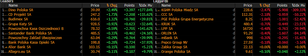 Na warszawskiej giełdzie przeważa konsolidacja, WIG20 zyskuje 0,2%, najlepiej radzą sobie Dino Polska i CD Projekt, a najsłabiej KGHM i CCC. mWIG40 spada o 0,4%, sWIG80 o 0,2%.