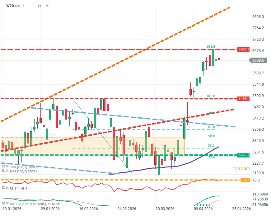 Kurs zatrzymał się dokładnie na poziomie zniesienia FIBO 161,8 i nieznacznie się cofnął. Z uwagi na podwyższony RSI na poziomie ok. 70 pkt scenariuszem bazowym może być obecnie konsolidacja w przedziale 3500–3650 oraz budowa bazy pod próbę wybicia powyżej poziomu FIBO 161,8. Źródło: xStation5