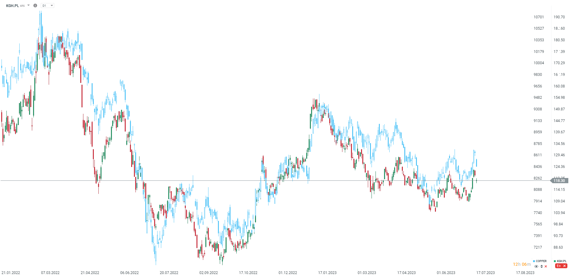 KGHM otwiera się luką spadkową po spadkach cen miedzi. Źródło: xStation5