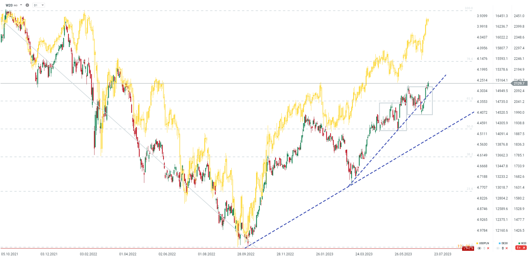 W20 wybija się dzisiaj ponownie ponad lokalne szczyty z połowy czerwca, kontynuując trend wzrostowy. Patrząc na USDPLN, dalsze wzrosty są możliwe. Kolejna ważna strefa oporu znajduje się dopiero w zakresie 2200 punktów oraz zniesienia 78.6 ostatniej dużej fali spadkowej. Źródło: xStation5