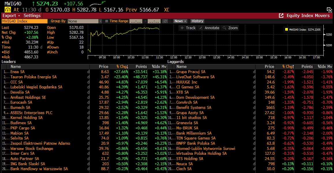 W mWIG40 przodują oczywiście spółki energetyczne. Sporo zyskuje również Bogdanka. Przypomnijmy, że na mWIG40 istnieje ETF o tickerze ETFBM40TR.PL. Źródło: Bloomberg
