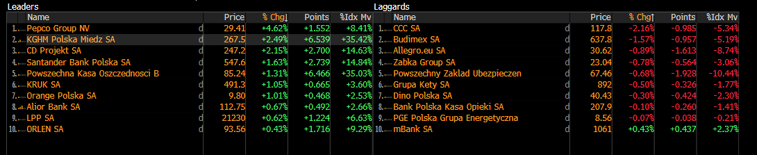 Przed świętami na polskim parkiecie dominuje zieleń. Na godzinę 11:55 WIG20 rośnie o ponad 0,6% i oscyluje wokół 3160 pkt, osiągając poziomy niewidziane od wielu lat. Sesję napędzają przede wszystkim akcje Pepco, które zwyżkują o ponad 4,5%, a także CD Projekt i KGHM, notujące wzrosty o ponad 2%. Z drugiej strony spadki notują Budimex i CCC, tracąc około 2%, co lekko hamuje indeks. Szeroki indeks WIG rośnie o 0,5%, a najlepiej na rynku radzi sobie indeks średnich spółek mWIG40, zwyżkując o około 0,9%. Najsłabiej wypada indeks małych spółek sWIG80, który pozostaje na poziomie zamknięcia poprzedniej sesji.