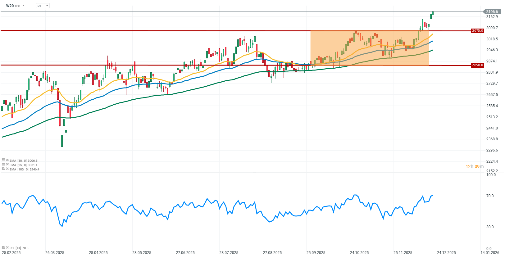 Kontrakty na indeks WIG20 (W20) zyskują podczas dzisiejszej sesji, a bykom sprzyjają zarówno ostatnie pozytywne wydarzenia rynkowe, jak i tzw. rajd świętego Mikołaja, który tradycyjnie rozpoczyna się na około pięć sesji przed końcem roku kalendarzowego. W tym okresie obserwuje się zwykle zwiększony popyt na akcje, co znacząco wspiera kupujących i działa jako silny bodziec prowzrostowy. Dodatkowo, pozytywne nastroje inwestorów są wzmacniane przez stabilne fundamenty gospodarki i dobrą kondycję spółek w indeksie, co sprawia, że końcówka roku sprzyja wzrostom.