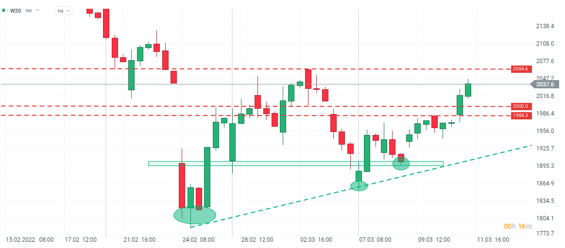 Indeks polskich blue-chipów kontynuuje ruch wzrostowy i zmierza w kierunku oporu blisko 2065 punktów. Źródło: xStation 5