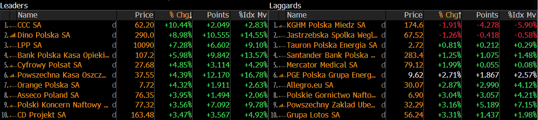 Spółki wchodzące w skład indeksu WIG20 (W20) i ich największe zmiany procentowe w ujęciu dziennym. Źródło: Bloomberg