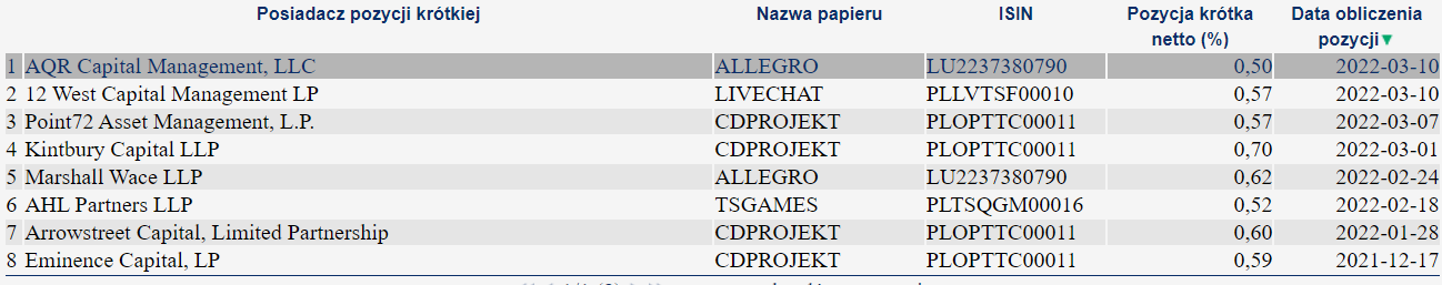 Zmianom uległ również rejestr krótkiej sprzedaży KNF, gdzie z pozycjami krótkimi na akcje Allegro (ALE.PL) oraz LiveChat (LVC.PL) odsłoniły się dwa fundusze ze Stanów Zjednoczonych.