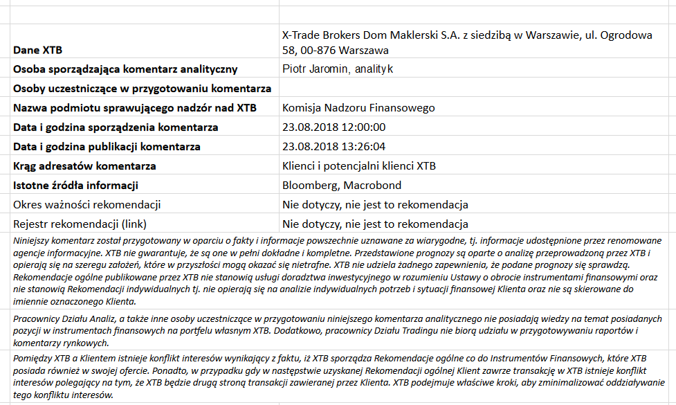 Ta publikacja handlowa jest informacyjna i edukacyjna. Nie jest rekomendacją inwestycyjną ani informacją rekomendującą lub sugerującą strategię inwestycyjną. W materiale nie sugerujemy żadnej strategii inwestycyjnej ani nie świadczymy usługi doradztwa inwestycyjnego. Materiał nie uwzględnia indywidualnej sytuacji finansowej, potrzeb i celów inwestycyjnych klienta. Nie jest też ofertą sprzedaży ani subskrypcji. Nie jest zaproszeniem do nabycia, reklamą ani promocją jakichkolwiek instrumentów finansowych. Publikację handlową przygotowaliśmy starannie i obiektywnie. Przedstawiamy stan faktyczny znany autorom w chwili tworzenia dokumentu. Nie umieszczamy w nim żadnych elementów oceniających. Informacje i badania oparte na historycznych danych lub wynikach oraz prognozy nie stanowią pewnego wskaźnika na przyszłość. Nie odpowiadamy za Twoje działania lub zaniechania, zwłaszcza za to, że zdecydujesz się nabyć lub zbyć instrumenty finansowe na podstawie informacji z tej publikacji handlowej. Nie odpowiadamy też za szkody, które mogą wynikać z bezpośredniego czy też pośredniego wykorzystania tych informacji. Inwestowanie jest ryzykowne. Inwestuj odpowiedzialnie.