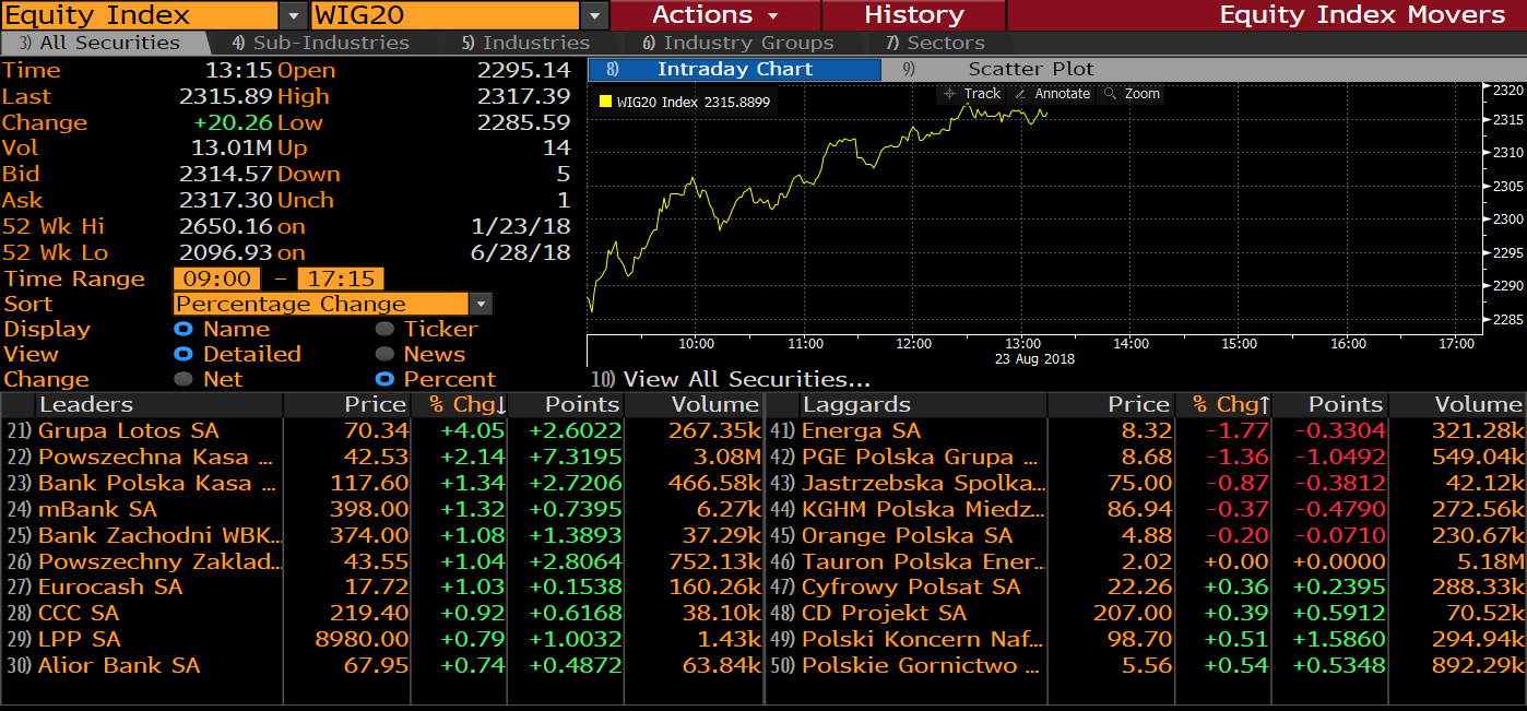 Najmocniejszą spółką jest dzisiaj Lotos (LTS.PL). Pod presją w dalszym ciągu pozostają spółki energetyczne. Źródło: Bloomberg.