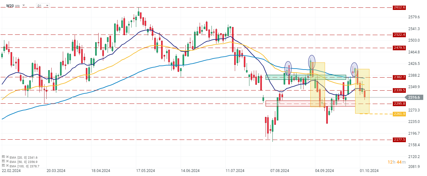 Notowania kontraktu na indeks WIG20 (W20) kontynuują przecenę, utrwalając przebicie poziomu wsparcia w ok. 2340 pkt. Zasięg korekty w przypadku przebicia mocniejszej strefy wsparcia na poziomie 2295 pkt. sięga 2261 pkt. Prawdopodobny scenariusz wskazuje jednak na zatrzymanie się notowań w korytarzu między 2295-2340 pkt. Trwałe wybicie notowań poza korytarz przy obecnym otoczeniu wydaje się bardziej prawdopodobne w przypadku dolnego przebicia ograniczeń. Źródło: xStation