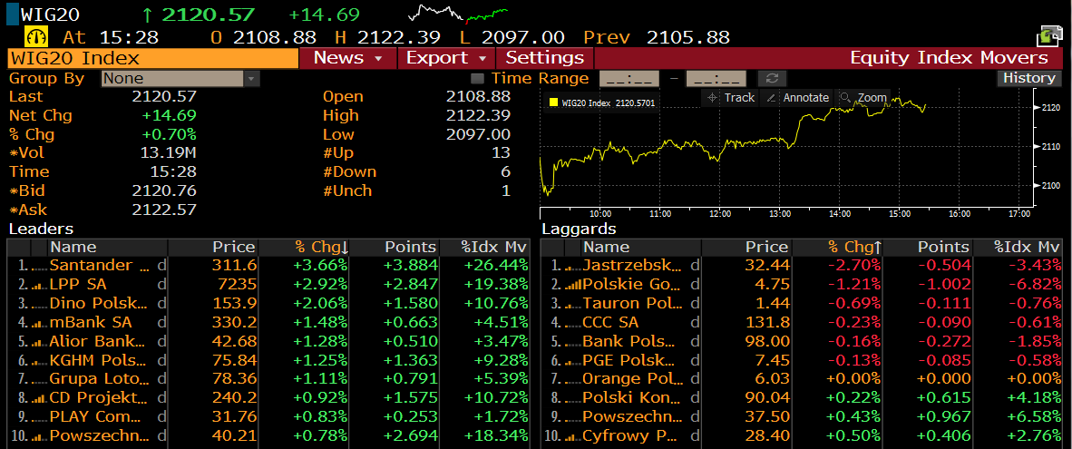 Jeśli chodzi o sytuację techniczną na W20, właściwie nie uległa ona zmianie od wczorajszej sesji. Rynek powoli odrabia ostatnie duże spadki. Tym samym strefa przy poziomie 2050 pkt pozostaje kluczowym wsparciem. Z kolei lokalne wsparcie intraday ukształtowało się przy poziomie 2085 pkt. Jeśli obecna tendencja się utrzyma, istnieje spora szansa na test bariery podażowej przy 2150 pkt. Niemniej tak długo jak kurs znajduje się poniżej, obowiązuje trend spadkowy.