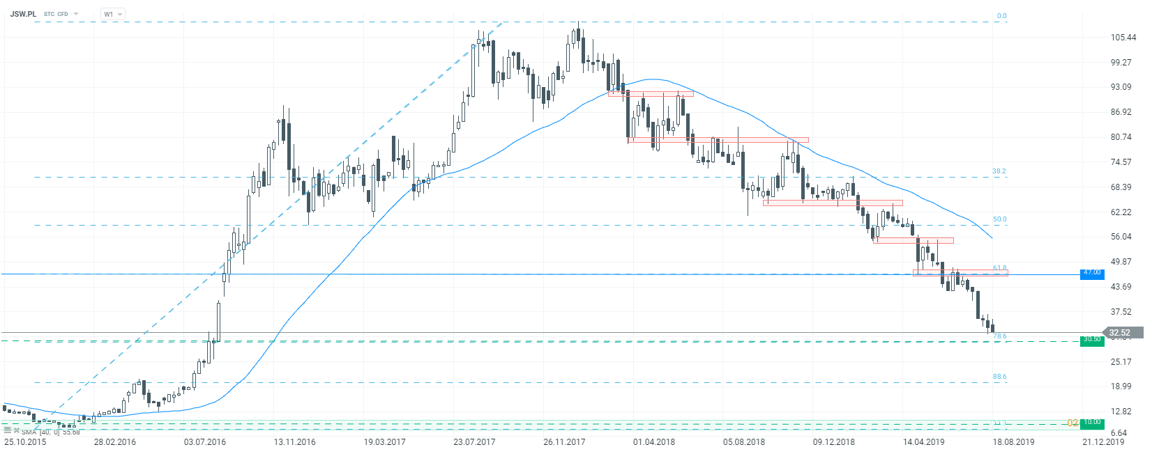 Pomimo wzrostów na indeksie WIG20, akcje Jastrzębskiej Spółki Węglowej (JSW.PL) tracą dziś ponad 2,5%. Po zakończeniu dzisiejszej sesji spółka opublikuje raport półroczny, jednak widać inwestorzy nie spodziewają się dobrych wyników. Spółka od dłuższego czasu znajduje się w trendzie spadkowym. Niewykluczone, że w najbliższym czasie zobaczymy atak na mierzenie 78,6% całej fali wzrostowej z interwału tygodniowego. Na razie brakuje jakichkolwiek sygnałów popytowych, dominują sprzedający.