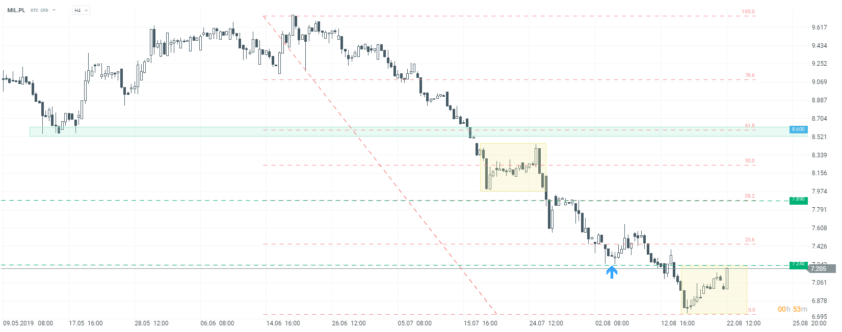 Pozytywnie na czwartkowej sesji wyróżnia się Millennium Bank (MIL.PL), który rośnie ponad 2,5%. Patrząc jednak na wykres spółki, nie ma powodów do zbyt dużej euforii. Kurs od połowy czerwca znajduje się w silnej tendencji spadkowej. Aktualnie cena zbliża się jednak do kluczowego oporu. Mowa tutaj o poziomie 7,24 zł, gdzie wypada górne ograniczenie układu Overbalance, czyli największej korekty na całym ostanim impulsie spadkowym oraz dołki z początku sierpnia. Dopiero pokonanie tego poziomu może przyczynić się do większej korekty wzrostowej, wtedy też możliwy byłby ruch w kierunku zniesienia 38,2% Fibonacciego - okolice 7,89 zł.