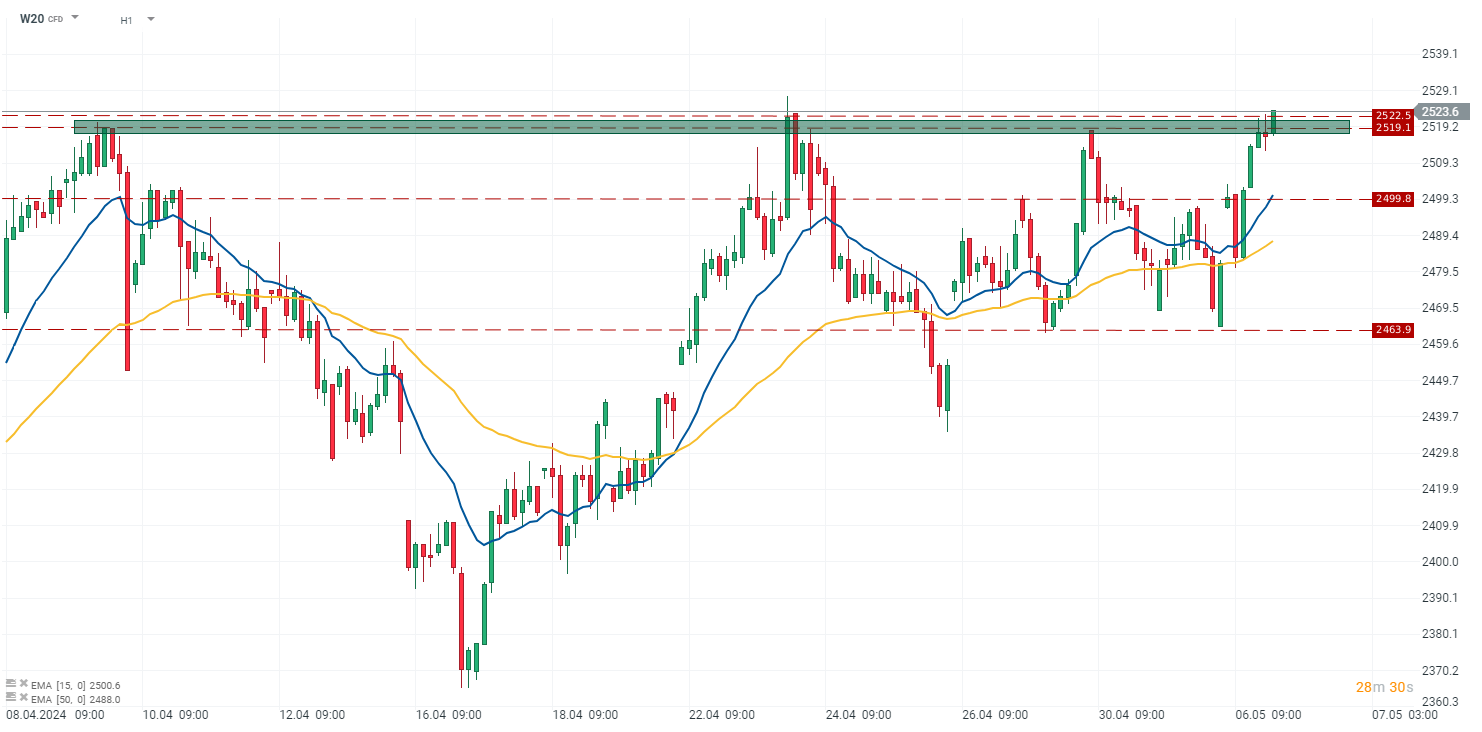 Kontrakt na indeks WIG20 (W20) w interwale 1-godz. testuje niestabilny poziom 2520 pkt. Ostatnie próby przejścia tego oporu kończyły się spadkami. Teraz jednak na rynku widać bardziej pozytywne nastroje inwestorów co może pomóc w utwierdzeniu przebicia oporu. Źródło: xStation