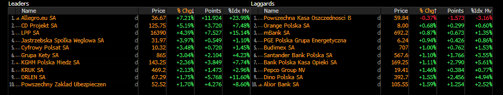 - CI Games (CIG.PL) zawarło umowę z Microsoftem o udostępnienie tytułów “Lords of the Fallen”, a także “Sniper Ghost Warriors Contracts 2” w ramach programu Game Pass. Usługa ta pomaga dotrzeć grze do większej liczby graczy, co w ocenie rynku stanowi bardzo pozytywny katalizator dla spółki. Producent gier rośnie dzisiaj o prawie 15%.