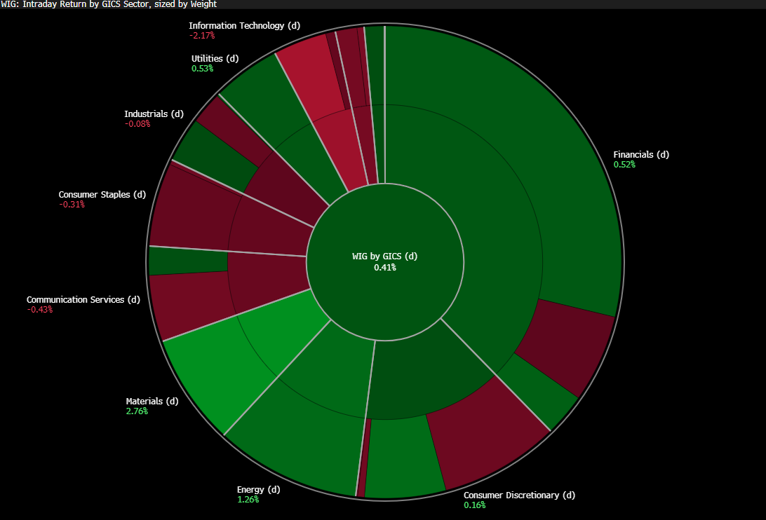 Szeroki rynek rośnie umiarkowanie. Indeks WIG zyskuje 0,35%, natomiast mniejsze indeksy radzą sobie nieco słabiej. mWIG40 i sWIG80 tracą odpowiednio 0,1% oraz 0,5%.