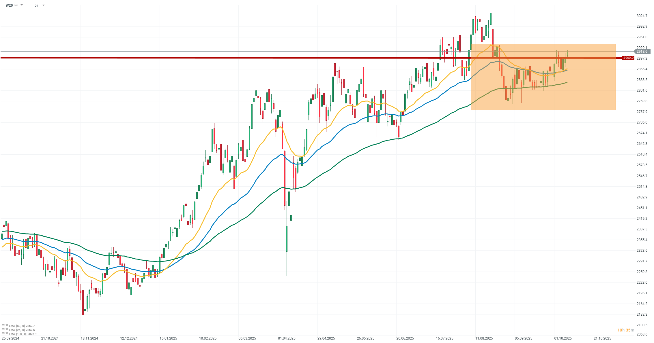 Notowania indeksu WIG20 przebijają poziom 2900 punktów. Kupującym bez wątpienia sprzyjała wczorajsza decyzja Rady Polityki Pieniężnej o obniżce stóp procentowych. Dzięki temu indeks zdołał wybić się z konsolidacji bocznej i rozpocząć trend wzrostowy. Kluczowe średnie kroczące znajdują się obecnie poniżej aktualnego poziomu indeksu, co potwierdza siłę wzrostów.