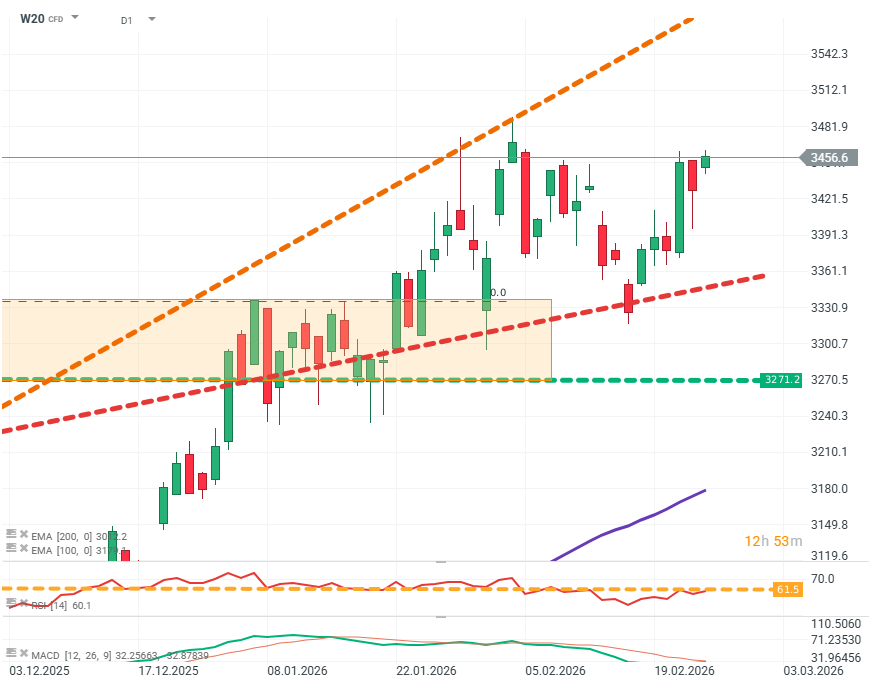 Od kilku tygodniu kurs utrzymuje się w wąskim kanale wzrostowym o niskim nachyleniu. RSI pozostaje na umiarkowanym poziomie. By podaż mogła przejąć inicjatywę konieczne było by zejście poniżej poziomu 3300 punktów. Scenariuszem bazowym na chwilę obecną jest dalsze poruszanie się wewnątrz kanału trendu.