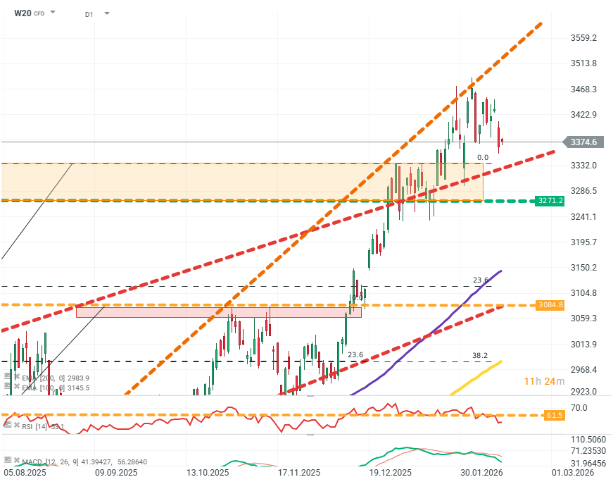 Kurs na wykresie utrzymuje stabilny wzrost w nowym kanale trendu, wyznaczonym po pokonaniu ostatnich maksimów. Jeśli podaż chce odzyskać inicjatywę, pierwszym warunkiem jest wybicie dołem z kanału do poziomów minimum 3300 punktów.