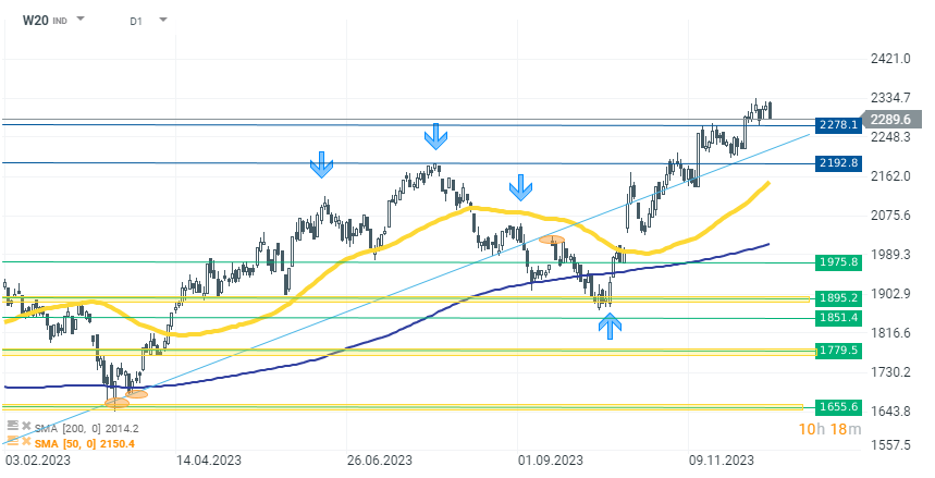 Spoglądając na wykres W20 widzimy, że notowania konsolidują się w okolicach szczytów. Jednak od kilku sesji giełdowych byki mają problem z wybiciem powyżej strefy 2300 punktów na stałe. W przypadku kontynuacji ruchu w górę w krótkim terminie kluczowe będzie utrzymanie wsparcia na poziomie 2280 punktów. Natomiast w przypadku większego zasięgu korekty, niewykluczone będzie przetestowanie poziomu 2190 punktów. Źródło: xStation 5