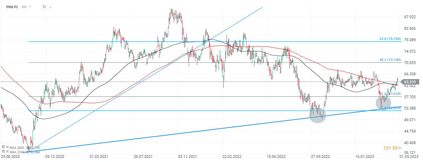 Wykres PK Orlen (PKN.PL), interwał D1.Cena akcji znajduje się w pozytywnym trendzie wzrostowym potwierdzonym linią trendu oraz formacją złotego krzyża, byczym przecięciem SMA200 (czerwona linia) od dołu przez SMA100 (czerwona linia). Cena znajduje się także powyżej SMA200 sygnalizując możliwe odwrócenie trendu. Najbliższym oporem wydaje się 70 PLN za walor, wyznaczone 38,2 zniesieniem Fibonacciego fali wzrostowej rozpoczętej w marcu 2020 roku oraz poprzednimi reakcjami cenowymi. Źródło: xStation5