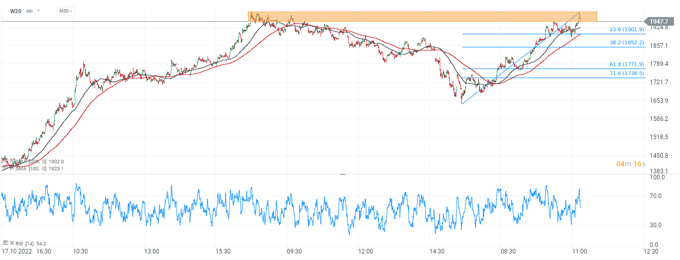 Wykres W20, interwał M30. Pierwsza próba ataku okolic 2000 pkt. została przerwana w czasie słabego odczytu PKB Niemiec, o 10:00, jednak byki wciąż trzymają się blisko strefy z której atak może nie stanowić problemu. RSI spadł w okolice 50 pkt sygnalizując neutralny poziom. Kluczowe dla byczego momentum będzie utrzymanie się powyżej 1850 pkt, gdzie widzimy SMA200 (czerwona linia). Źródło: xStation5