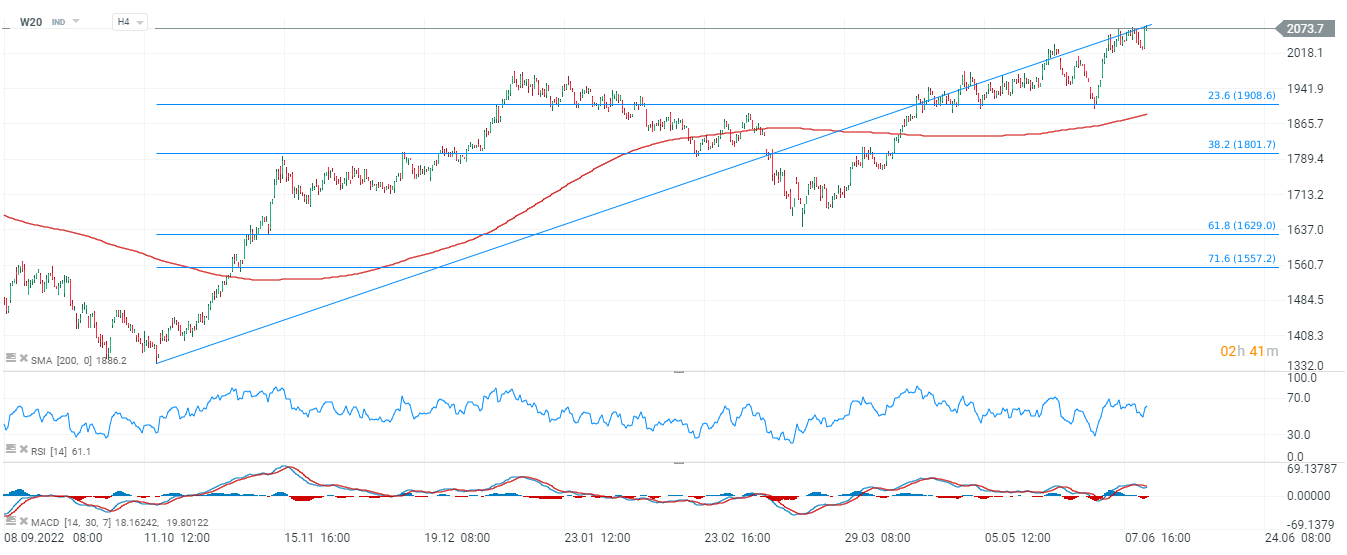 W20 notuje świetną sesję i wspina się na 14 miesięczne maksima. Główne wsparcie przebiega w okolicach 1900 pkt (SMA200, 23,6 zniesienie Fibo fali wzrostowej z jesieni 2022). Źródło: xStation5