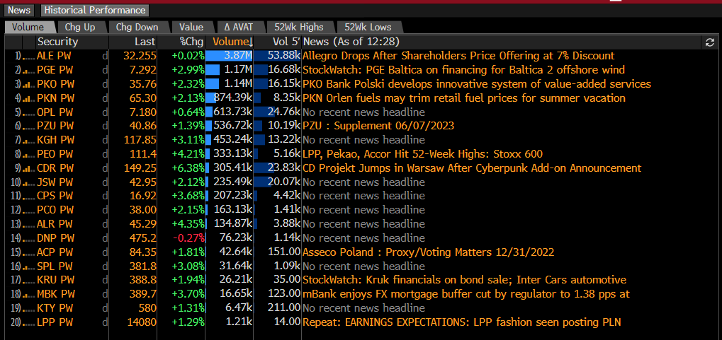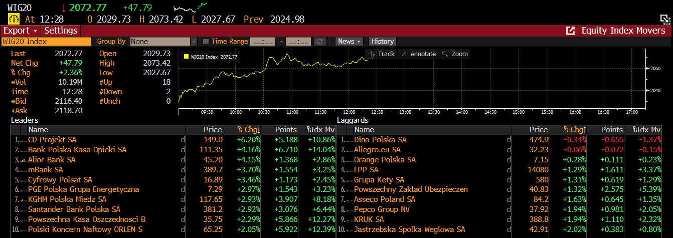Najaktywniejsze walory z benchmarku WIG20. Poza walorami Dino (DNP.PL) i Allegro (ALE.PL) które nieznacznie tracą widać wielki optymizm. Źródło: Bloomberg