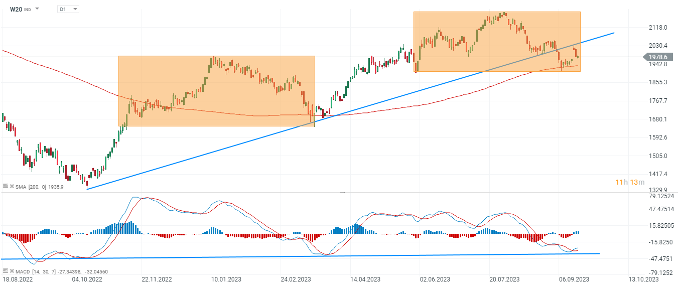 W20 złamał wzrostowąl linię trendu i ostatnie wzrosty zostały szybko zredukowane po tym jak cena ponownie dotarła do tej linii. Głównym wsparciem wydaje się SMA200 (czerwona linia) przy 1935 pkt Źródło: xStation5
