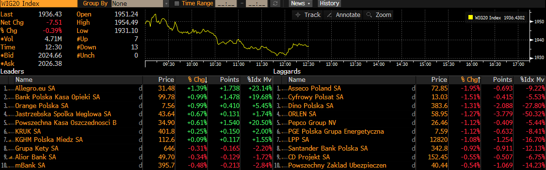 Spośród spółek z WIG20 najlepiej radzi sobie dziś JSW i KGHM, surowcowe spółki ostatnio notują mocniejszą passę. Najlepiej wygląda Allegro i PKO. Najsłabiej wyglądają walory Orlenu, PKO i Dino Polska. Źródło: Bloomberg