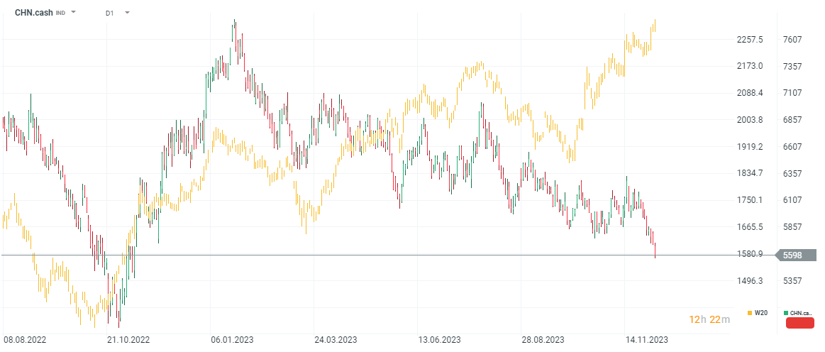 W20 (złoty wykres) ewidentnie wymazał korelację z chińskimi indeksami (CHN.cash), z którymi korelował w ramach Emerging Markets. Tym razem potężne spadki na chińskiej giełdzie nie przynoszą spadków na GPW, a korelacja zmieniła się w dywergencję. Źródło: xStation5