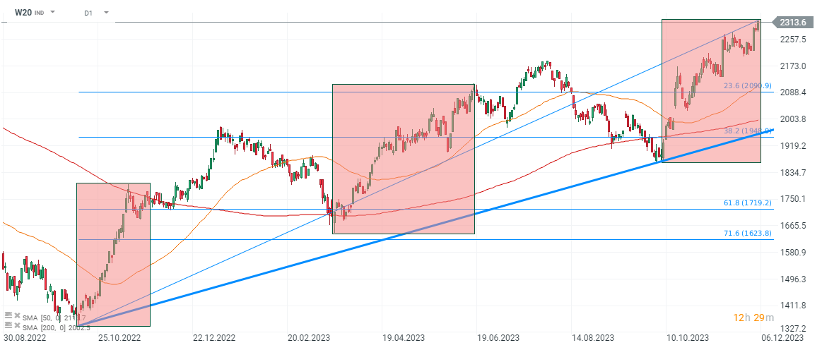 Notowania W20 znajdują się w tendencji wzrostowej i patrząc na ostatnie wzrostowe fale, widzimy, że ich zasięg był bardzo zbliżony, choć różnie rozciągnięty w czasie (dynamika) i wynosił ok. 400 punktów. W przypadku krótkoterminowego cofnięcia, jako najbliższe wsparcie należy niezmiennie obserwować poziom 2230 pkt tj. dolne ograniczenie geometrii 1:1. W przypadku większej, ok. 10% korekty istotny może okazać się poziom 2100 punktów, gdzie widzimy 23,6 zniesienie fali wzrostowej z jesieni 2022 roku. Niemniej jednak w każdej z poprzednich fal wzrostowych, indeks po chwilowym ochłodzeniu (konsolidacji lub płytkiej korekty) kontynuował wzrost i osiągał nowe maksima 'w drugiej fali', po których dopiero przychodziła większa korekta. Taki scenariusz tym razem mógłby zrealizować się po dotarciu indeksu w okolice bliskie historycznych maksimów przy 2500 punktów. O ile sentyment na giełdach globalnych będzie wciąż pozytywny i tym razem, taki scenariusz ten wydaje się możliwy do realizacji. Źródło: xStation5
