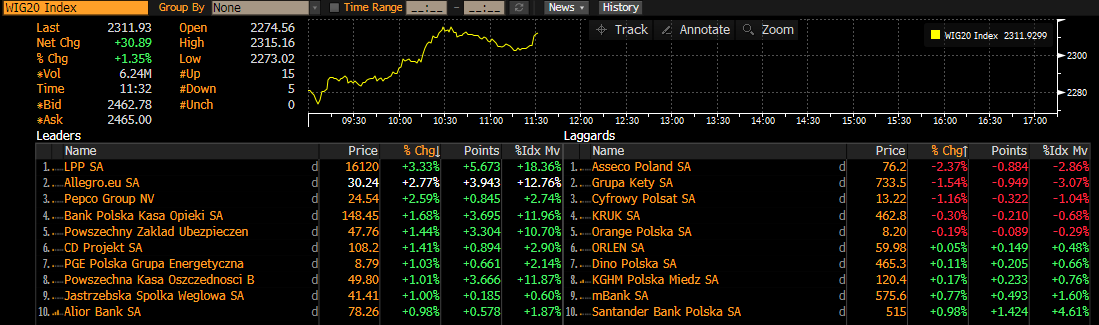 Spośród WIG20 najwyższe wzrosty notuje Allegro i LPP. Pepco okazuje się odporne na niedźwiedzie komentarze analityków. Źródło: Bloomberg Finance L.P.