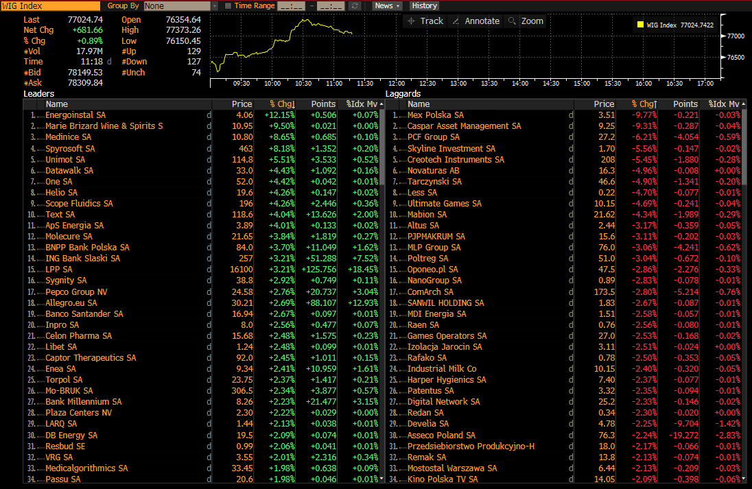 Ciekawy rozdźwięk widzimy między walorami z WIG-Odzież (świąteczna sezonowość), a WIG-Nieruchomości gdzie inwestorzy prawdopodobnie wyceniają ryzyko potencjalnego zawieszenia programu Bezpieczny Kredyt 2% przez opozycję, w nowym roku. Jego zamknięcie potencjalnie mogłoby postawić w trudnej sytuacji deweloperów, którzy ruszyli z dużymi projektami, zwiększając podaż mieszkań, przy prawdopodobnie wielokrotnie niższym r/r popycie na kredyty hipoteczne w roku 2024. Rynek wycenia potencjalnie ograniczony potencjał wzrosty marż sektora deweloperskiego, przy cenach lokali bliskich górnej granicy tolerancji kredytobiorców. Do najsłabszych walorów na GPW należą dziś Mostostal Warszawa (MSW.PL) i Develia (DVL.PL). Z 'odzieżówki' i producentów obuwia świetnie radzą sobie LPP (LPP.PL), CCC (CCC.PL) i Monnari (MON.PL), blisko 1,3% spadkiem wyróżnia się Wojas (WOJ.PL).
