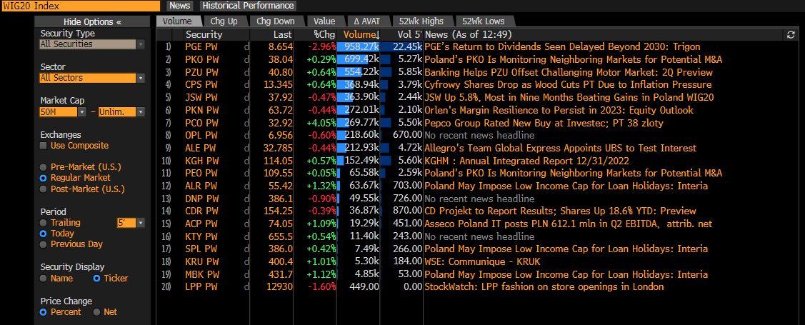 Aktualizacja głównych wiadomości z GPW. Źródło: Bloomberg Finance LP