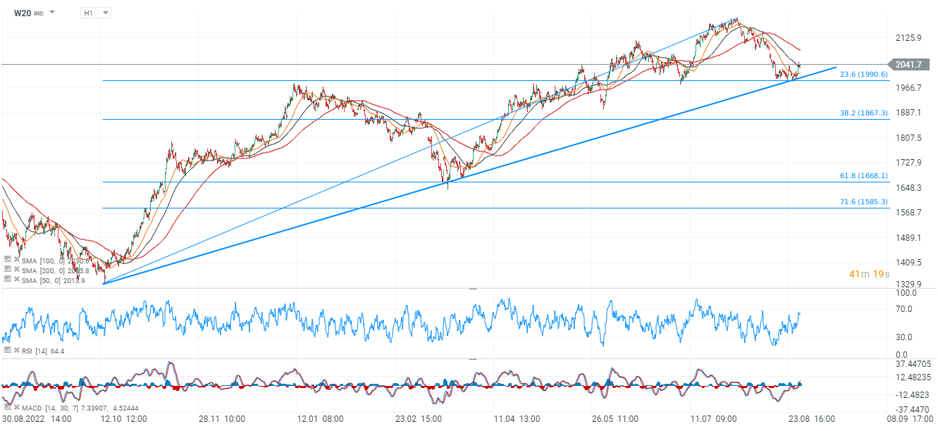 W20 obronił się w strefie kluczowego wsparcia przy poziomie 2000 punktów, zdołał odbić od okolic 23,6 zniesienia Fibonacciego fali wzrostowej z jesieni 2022. Warto podkreślić, że spadki te zostały zatrzymane w kluczowej strefie wsparcia. Źródło: xStation5