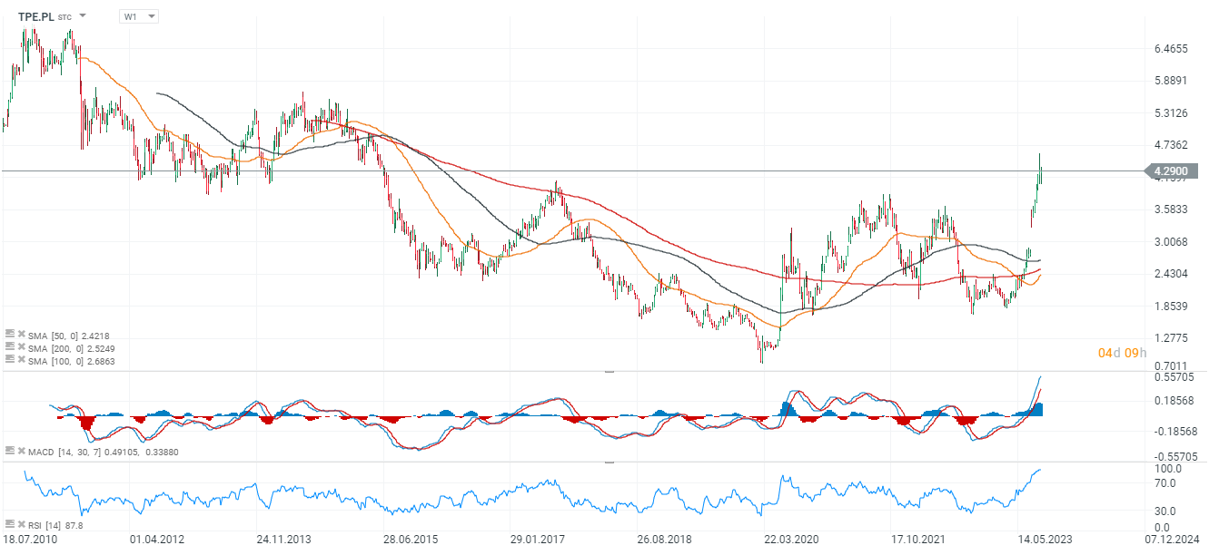 Patrząc na akcje Tauronu widzimy na interwale W1 poziomy bliskie ekstremalnemu wykupieniu (RSI blisko 90 pkt) co wskazuje na potencjalnie niżśzą premię za ryzyko po imponującym rajdzie. Także MACD wysyła dość kontrariański sygnał, a akcje notują dziś niewielkie cofnięcie mimo rekomendacji 'Kupuj' w Trigon co potencjalnie wyzwala sprzedaż faktów. Z drugiej strony jednak w długim terminie spółka ma wciaż sporo do nadrobienia patrząc na ceny akcji sprzed lat.
