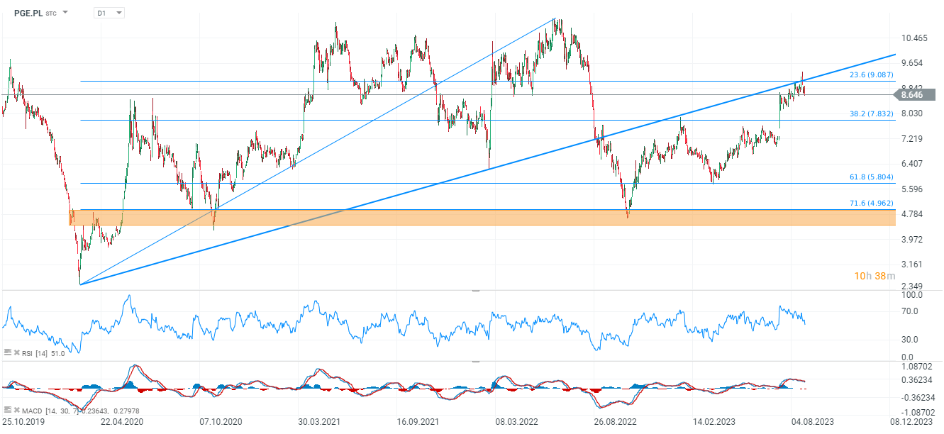 Akcje PGE (PGE.PL), interwał D1. Walory spółki notują dziś niemal 3% spadki, które rozpoczęły się po dotarciu do linii trendu oraz 23,6 zniesienia Fibonacciego fali wzrostowej z wiosny 2020. Obraz techniczny wygląda więc dość niedźwiedzio i od strony akcji cenowej możliwe wydaje się przetestowanei poziomu 8 PLN za akcję. Źródło: xStation5