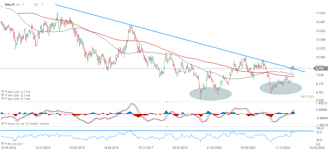 Wykres walorów Enea wygląda dużo bardziej zachęcająco. Akcje przełamały długoterminową linię spadkowego trendu, a firma zyskuje dziś 1%. Okolice 5 PLN za walor zostały kolejny raz wybronione w 2022 roku, a średnie SMA100 i SMA200 gwałtownie przełamane byczą luką wzrostową. Kluczowe dla spółki będzie utrzymać się powyżej poziomu wyznaczonego przez linię trendu - z pewnością od strony technicznej istnieje nadzieja na przełamanie stagnacji oraz wyższe poziomy i retest ostatnich, lokalnych szczytów przy 10,5 PLN za walor.