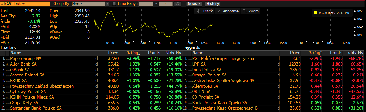 Zmiany cenowe spółek z WIG20. Liderem wzrostów jest Grupa Pepco (PEP.PL), wciąż słabo radzi sobie Dino (DNP.PL). Blisko 3% spadki widzimy na PGE (PGE.PL). Źródło: Bloomberg Finance LP