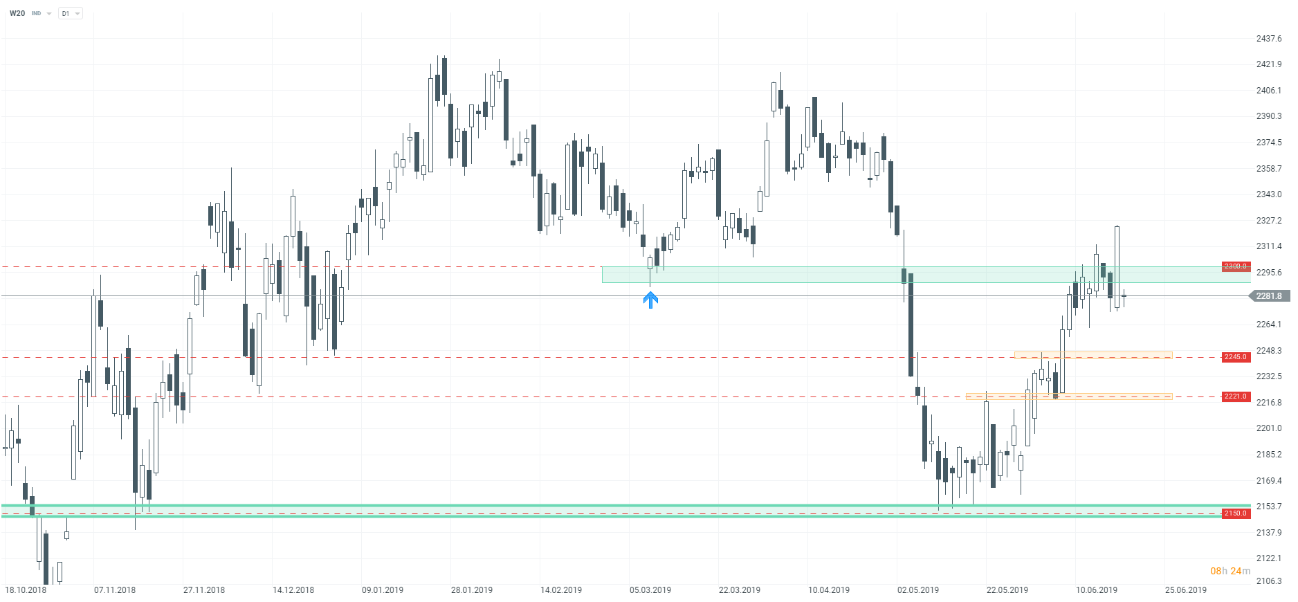 W poniedziałek 19 czerwca polska giełda otwiera się na wyraźnym minusie. Do końca sesji zostało już niewiele czasu, a indeks W20 utrzymuje się w okolicach ceny otwarcia, kurs konsoliduje w bardzo wąskim zakresie. Aktualnie W20 traci 0,15%. Po wczorasjzych wzrostach na ponad 2%, dzisiejsze spadki nie są niczym spektakularnym. Dzisiejsze niskie otwarcie wynika głównie z rolowania kontraktu. Pokonany wczoraj poziom 2300 pkt, miał dziś stanowić wsparcie, jednak z powodu rolowania muismy go pominać. W ostatnich dniach indeks nie zachowywał się zbyt technicznie, dlatego należy poczekać na rozjaśnienie sytuacji. Niewykluczone, że jutro indeks ponownie otworzy się luką, pamiętajmy, że dziś w USA poznamy decyzję w sprawie stóp procentowych, która może mieć duży wpływ nie tylko na rynek walutowy ale także na indeksy giełdowe.