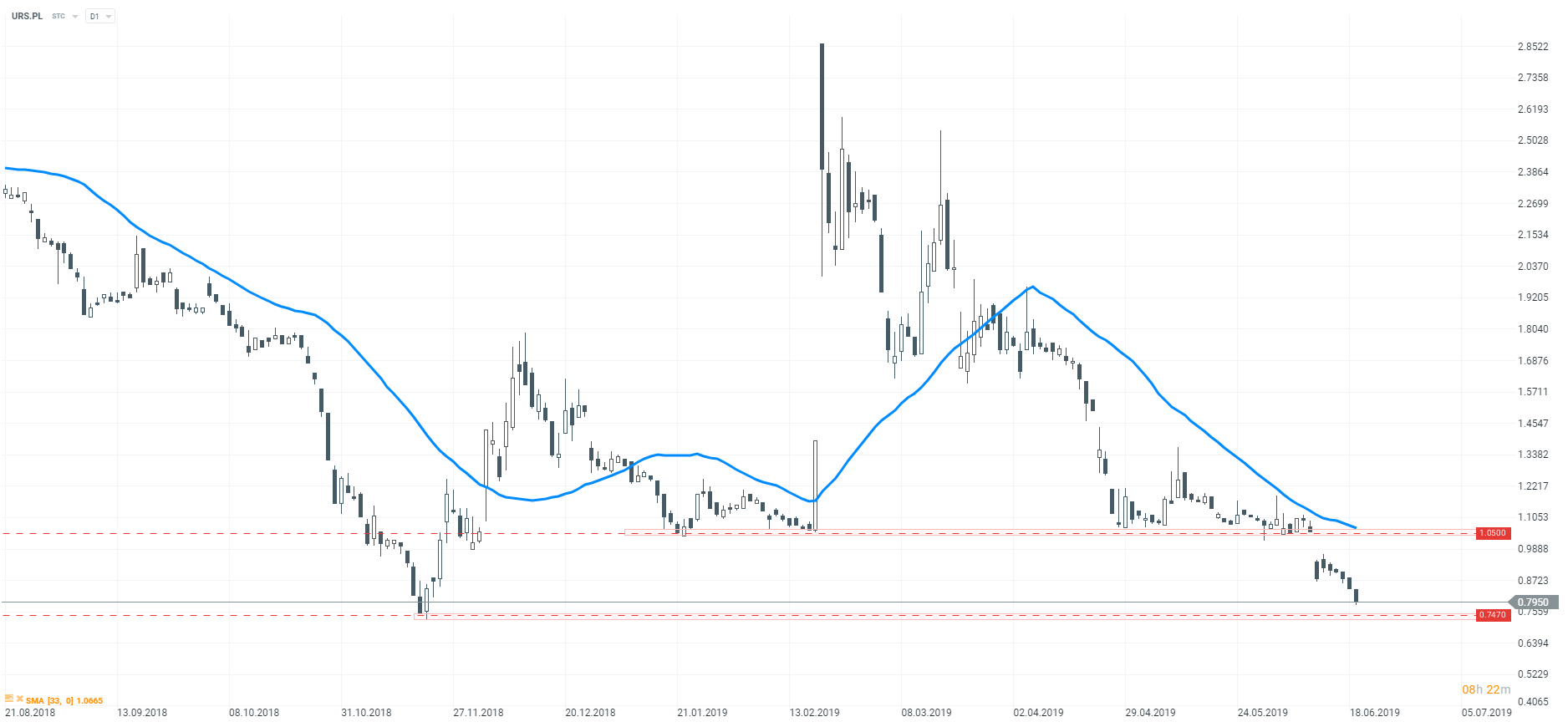 Drugą poddaną analizie spółką jest Ursus, który jest jedną z najmocniej tracących dziś spółek. W środę 19 czerwca możemy obserwować spadki na blisko 6%. Sytuacja techniczna jest kiepska. Aktualnie cena może się kierować na dołki z listopada 2018 roku. Dopóki kurs znajduje się poniżej poziomu 1,05 zł, obowiązuje tendencja spadkowa i nie ma mowy o większych wzrostach.
