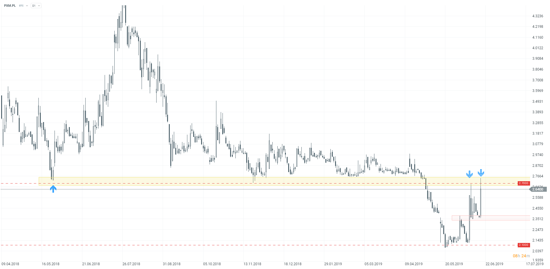 Na uwagę zasługuje dzisiaj spółka Polimex-Mostostal, która rośnie ponad 11%. Jednak patrząc technicznie, kurs dotarł do kluczowej strefy oporowej. Mowa tutaj o okolicach poziomu 2,7 zł za jedną akcję. Jeżeli nie dojdzie do wybicia górą, to cały czas mówimy o trendzie spadkowym. Jednak ostatnia reakcja popytu w lokalnej strefie wsparcia przy 2,35 zł, może napawać pewnym optymizmem. Jeżeli opór przy 2,7 zł zostanie pokonany, spółka może wreszcie wkroczyć w większy impuls wzrostowy. Jesteśmy więc w kluczowym miejscu i należy bacznie przyglądać się sytuacji.