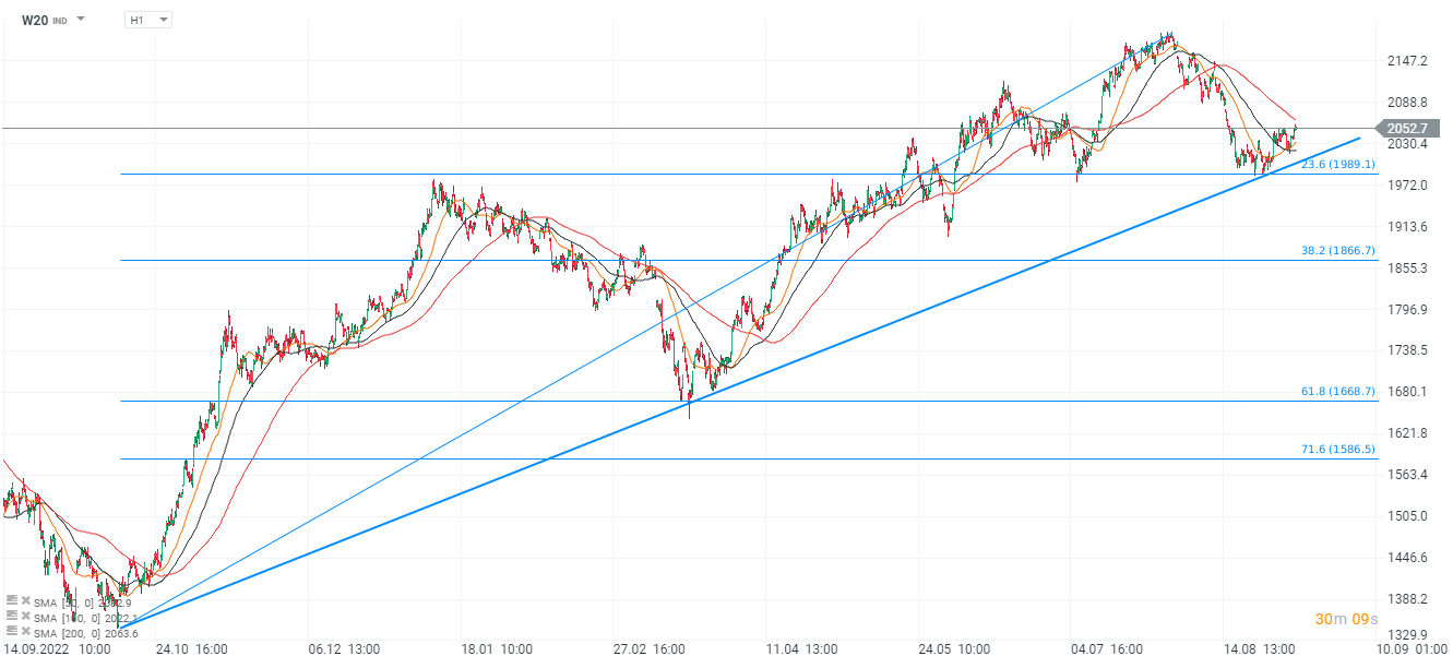 - W20 notuje niewielkie 0,3% odbicie na początku tygodnia i notowany jest w okolicach 2050 pkt