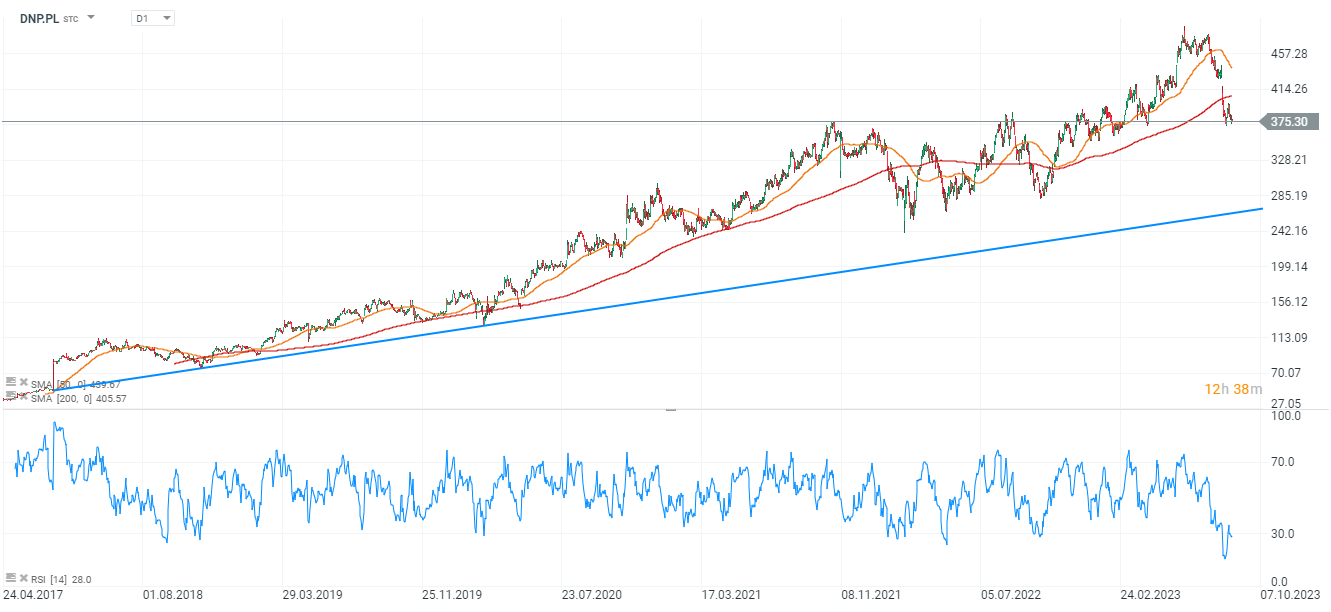 Patrząc na wykres Dino widzimy, że poprzednie spadki poniżej SMA200 wskazwały na 'okazję', wskaźnik RSI na D1 spadł do 28 pkt. sygnalizujac mocne wyprzedanie. Źródło: xStation5